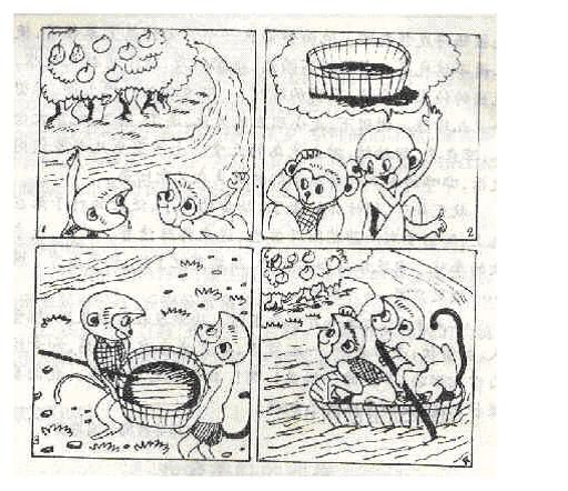 两只猴子玩时发现对面的河岸有一片桃林,树上结满了又大又红的桃子。它们在想过河的办法,一个猴子说:“可以用木盆当小船。”于是,两只猴子找来木盆,高高兴兴地过河。