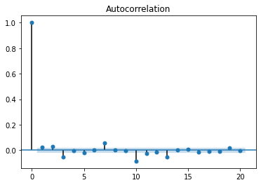 plot_acf(pca1.dropna(), lags=20, alpha=0.05)