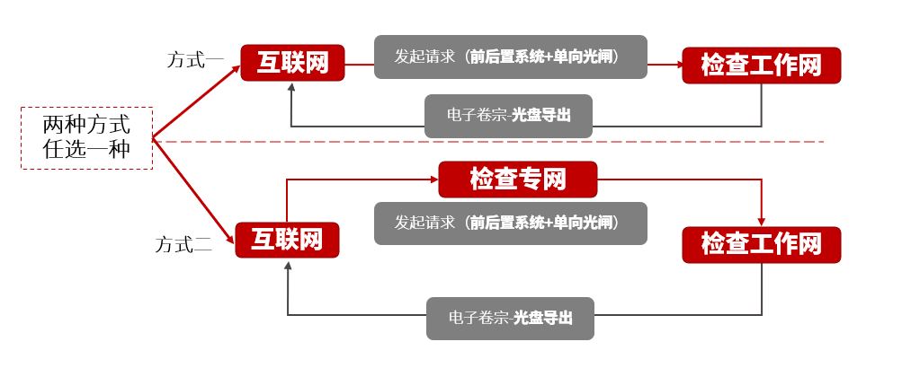 此场景涉及到两种数据摆渡方式:阅卷申请等数据由互联网到检察专网,或由互联网到检察工作网再到检察专网,两种方式均需采用前后置+单向光闸模式进行隔离摆渡。由于检察专网为SM网络,故电子卷宗等数据的导出只允许光盘方式。具体实现方式如下: