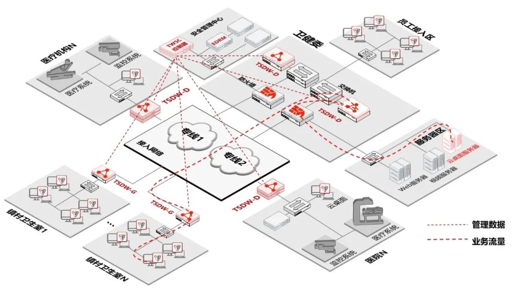1. TWSC安全控制管理系统部署在卫健委,提供TSDW边缘安全网关设备ZTP部署、一键组网、策略下发、可视化监控等功能。2. TSDW边缘安全网关设备在卫健委采用旁路部署,在分支机构直接作为网关设备部署,实现各个分支机构与卫健委总部之间的互联互通。