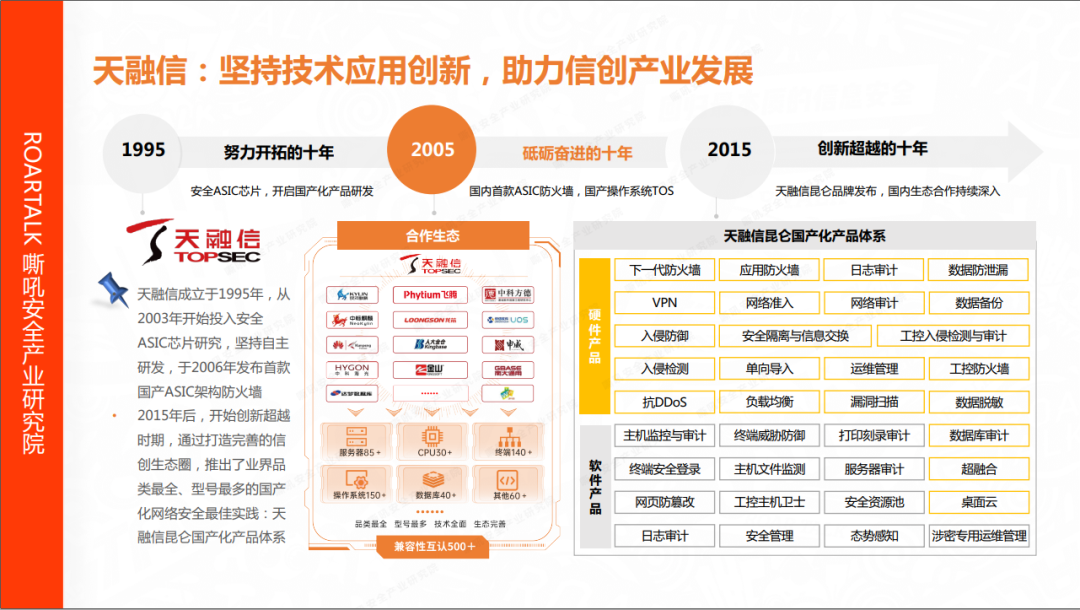 “十四五”时期信创产业步入全面发展阶段,市场规模进一步扩大。作为最早布局信创产业的网络安全企业之一,天融信从自主ASIC芯片研究到国产CPU芯片应用研究、从推出国内首款具有自主知识产权的ASIC架构防火墙到发布基于国产软硬件的天融信昆仑国产化产品体系,始终走在网络安全自主创新事业的最前沿。基于与飞腾、龙芯、兆芯、申威、海光等上下游企业的深度技术融合,天融信昆仑国产化产品体系已取得600+兼容性认证证书,全力推动信创产业快速发展。