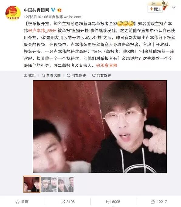 那天下播之后,卢本伟把29杀的视频传到了微博,除了往常的“卢本伟牛逼”之外,质疑作弊的声音也渐渐升高。