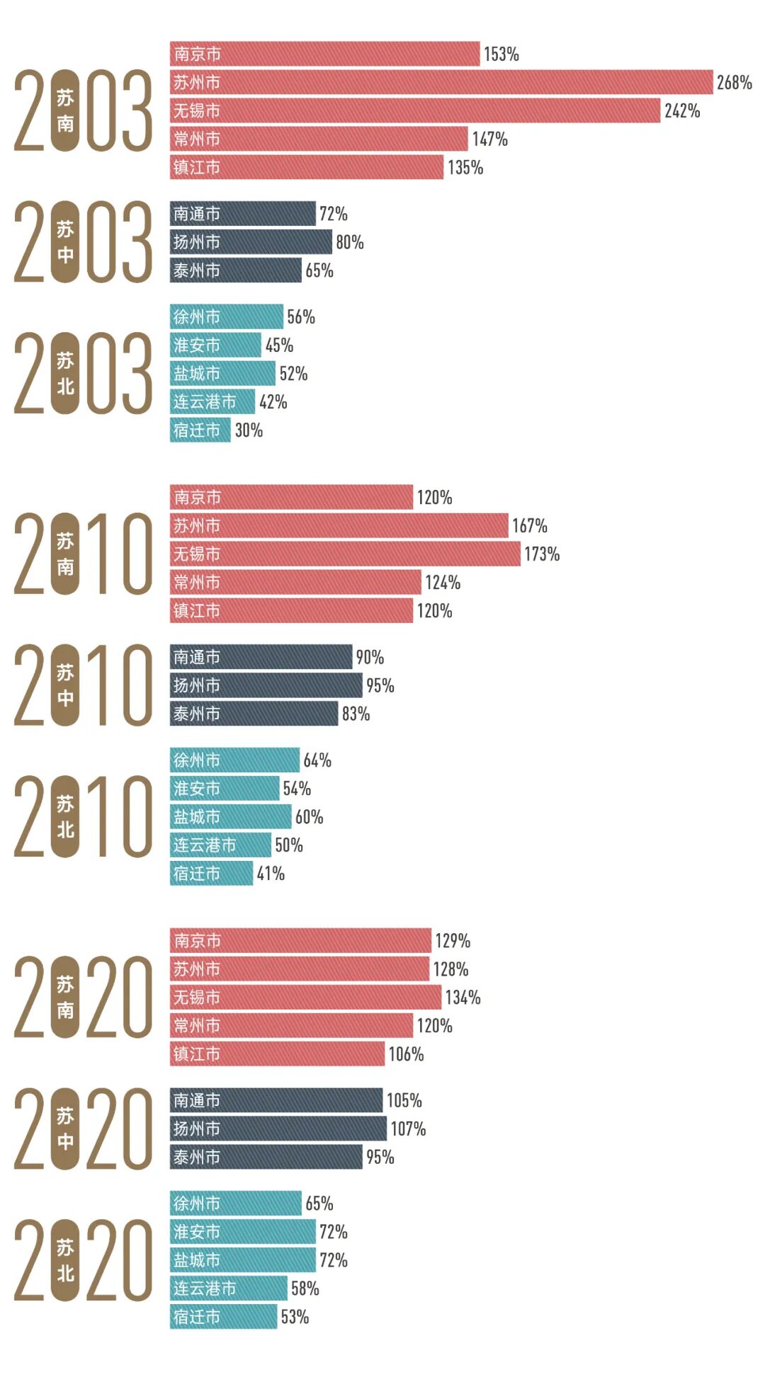 这在数字上可以清晰地体现出来。首先值得注意的一点是,虽然这些年江苏省内各地的人均GDP发生巨大变化,但各大区域在全省经济总量中的比重却非常稳定,苏南、苏中、苏北这三大板块的比重基本上一直都是6:2:2: