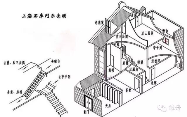 这张示意图非常生动具体地展现了石库门建筑的透视结构,这是一位夏宇(音)老先生画的,上次还被上海电视台盗用了,劝他去告,结果他说,算了,我这图被人都盗用了无数次了,他也懒得花这个力气了。以前不少人不明这种石库门结构,把“亭子间”什么的都解释错了,其实这原本是灶披间和晒台中间的一个夹层,易于漏雨,最不舒适。石库门居住起来其实很不舒服,尤其在后来被切割成七八个单元给人住后,更是如此。现在北外滩那边还有一些石库门房子,很多人说这是文化遗产,有旧上海情调,其实这个房子没多少保留价值,建筑的容积率低,而且早过了设计年限:砖木结构使用年限只有40年,现在已经两个40年了。这种1930年代的石库门,很难保留,最关键的是它没有下水道。住起来其实也很不舒服,你要觉得有情调你去住?新式石库门基本是1927年后发展起来的,当时租界住宅升级换代。其特点是:除大门和天井外,房屋结构已全部西洋化,砖承重,不用木柱。在此之前,1924年建的霞飞坊(现淮海坊,已是保护建筑),结构上就已完全和西方的房子一样。石库门建筑前后断断续续造了六十年(从1870年代算起)。当时还有一种公寓房,原本是有大片公用区域的,供出租用,大致类似于现在的酒店式公寓。1949年之前租界建的房子,如新式里弄等,一砖一瓦,95%以上都是进口的——我们那时修房时一次师傅给我看,钉子是方形的,叫“花旗钉”,美国进口,地板木料是北美洋松,解放后用的是国产的杉木,杉木最不耐磨,所以完全不好比。传统中国的建筑,不耐久存,原因之一是为节省材料,一平方米的墙,实砌的话需144块砖,半实砌76块,但民间多是空斗,只用58块砖。1949年后,建筑式样大为变化。最初是1952年建的“两万户工房”,它完全是抄自苏联的工人住房式样。其建筑群无封闭概念,两层,灶间等几户公用。之前工人、平民很多住在棚户区,这种式样已相当不错。但袭用苏联时较少考虑本地情形,例如楼梯开在南面(后来改为缩进)、很费木材,因为苏联不缺。1956年后再不造这种式样,太费木材,中国不像苏联那样不缺木料。1960-70年代初则兴起集体住宅,当时的典型是改造的番瓜弄。这种住宅奠定了之后20年的基础:6层,无电梯,多户公用灶台等。其实当时上层也知道是独用好,康平路100号,1960年代初造给干部的,也都是独用的,但给工人的,还是公用的。当时的房屋质量,差得现在难以想像,几乎刚建好就要开始修补。集体住宅很失败,1970年代初开始破除,逐渐改为煤卫独用。到1970-80年代则是曲阳新村为代表的公房,煤卫等已经开始独用。1990年代之后则是延续至今的商品房。- 居住方式:租赁为主,历史上上海不买房,大多是租的,1990年代后才变为买房为主;
