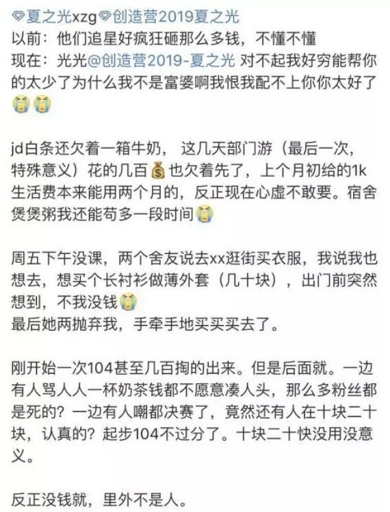 一边是花呗、白条、贷款框框砸,一边又把白piao的粉丝骂成狗,甚至前期投钱后期没跟上的也被人群嘲,起步104不过分,十块、二十快没用没意义,反正没钱就里外不是人。