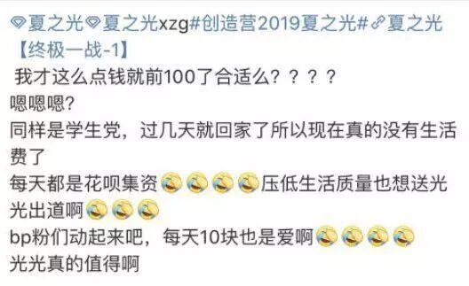 比如前段时间说红不红说糊不糊的《创造营》,热度肯定不比去年那些选秀节目,但追星姐妹们的热情还是一如既往地高涨,该反黑反黑、该打榜打榜,甚至为决赛集资千万,不遗余力也要送喜欢的小哥哥成团出道。