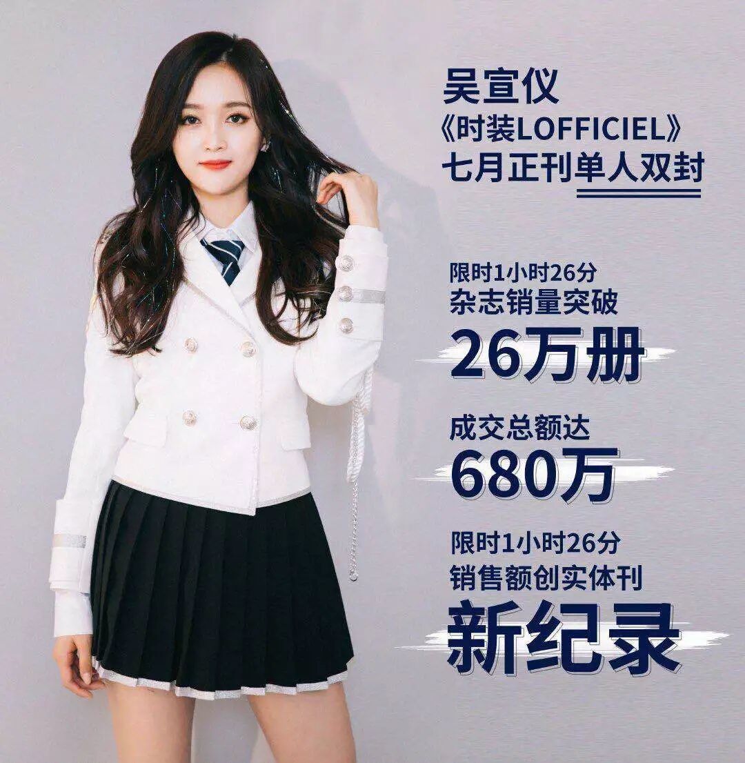 吴宣仪登上《时装LOFFICIEL》杂志封面的七月刊,昨天下午才刚上线,不到2小时销量高达26万+,销售额直逼680万,成为95后首位双封面女星,打破了国内实体杂志最高销量纪录。