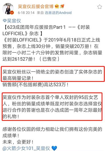 而且明确表示,这次杂志销量破记录只是粉丝为了庆祝吴宣仪成团一周年的礼物,并没有什么其他的意思,也奉劝各位不要比来比去。