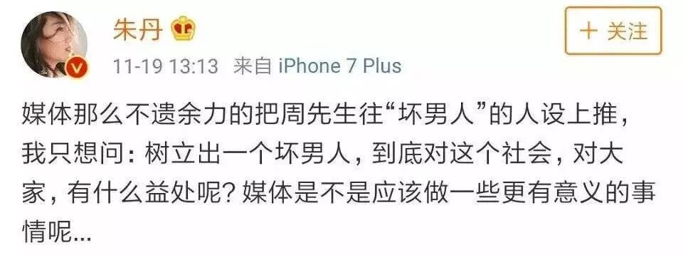 昨天出了事,周一围秉承不理会的态度,朱丹却急着跳出来怼媒体,认为是故意带节奏把周一围往“坏男人”的人设上推。