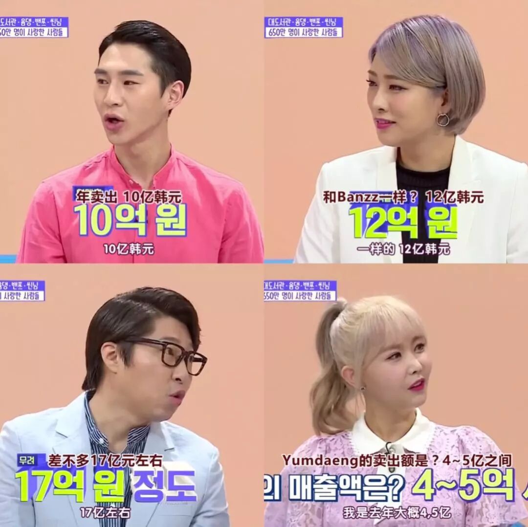 奔驰小哥年入10亿韩元、新姐年入12亿韩元、大图书馆年入17亿韩元、元老Y姐年入 5 亿韩元。