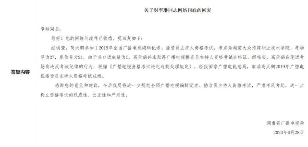 正当南风替他惋惜的时候,一个大锤抡了过来。官方前脚发通告实锤高天鹤在主持人考试笔试时的作bi行为,取消了他去年的考试成绩,但实际上他口试没过也并没有拿到证,可是这个行为触犯了大家的底线。