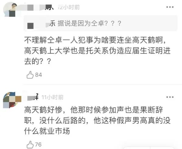 事情发生之后,高天鹤粉丝和仝卓粉丝自行站在了对立面为自己哥哥呐喊。仝卓粉丝的基调就是哥哥独自美丽,请勿cue前同事,“连坐”更是无稽之谈,还说高天鹤是人废怪连累;高天鹤粉丝那边呢?倒也是专注自家比较多,在线打假高天鹤没有作bi,是主动离职,正常解约。