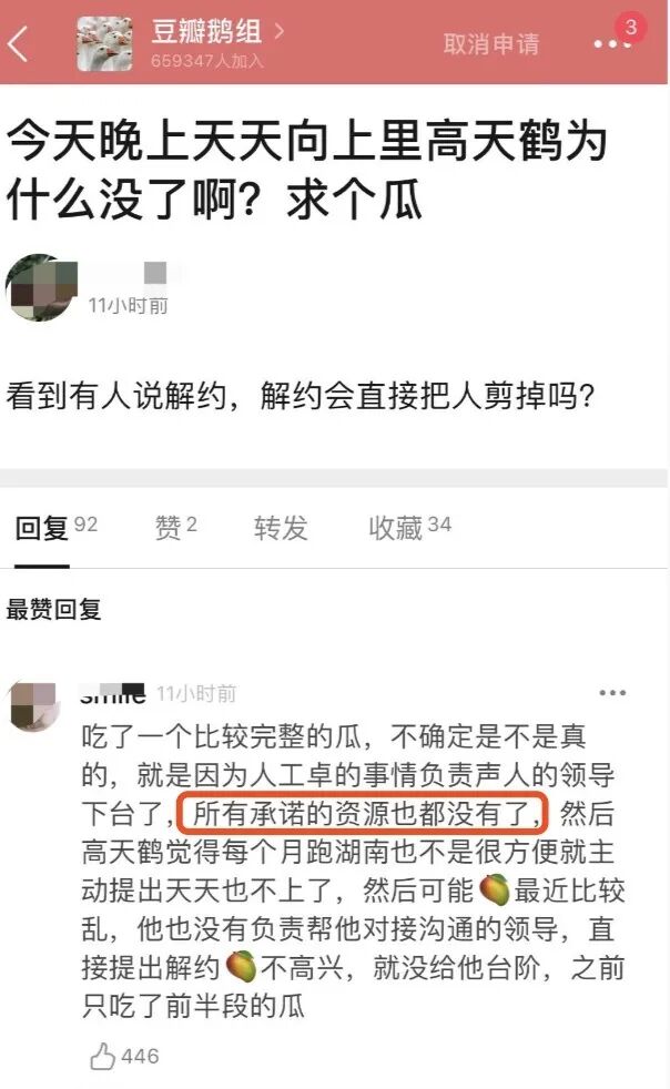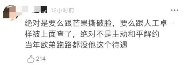 第三个是因为和芒果解约,据说因为之前人工卓的事情,承诺给他们的后续资源也跟着泡汤了,这事不知是真是假,但听着倒也不是全无道理。