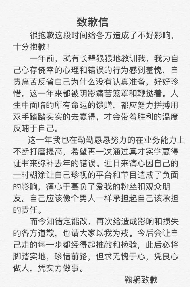 高天鹤后脚发微博道歉,表示自己一年来都被阴影痛苦笼罩和鞭挞着。害,夸张是有点儿夸张了,要不是因为有人举报被发现了也不会痛苦,真的痛苦当初就不会这么做了,但他辜负了粉丝和观众倒是真的。