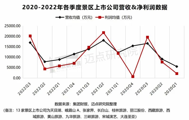 迈点研究院对13家景区上市公司2020-2022年各季度营收数据进行盘点,数据显示:2021年各季度数据整体好于2020年;受疫情影响,2020年第一季度经营惨淡,第四季度宋城演艺(300144.SZ)亏损188600万元,归母净利润均值呈现悬崖式下跌态势。2022年上半年整体数据略高于2020年第一季度、第二季度;但第三季度景区迅速“回血”,营收数据表现三年最佳。三季度景区发展“游刃有余”,国内疫情逐渐受控叠加跨省游熔断范围收窄,国内旅游需求快速复苏。暑期景区涌现“免票优惠潮”,近五百家景区在携程上线优惠产品,湖南张家界、陕西华山等多个知名旅游景区开启免票活动。一轮轮合力拉动旅游市场复苏的景区活动,覆盖了安徽、福建、广东等全国26个主要省市。7月份文旅部公布黄河壶口瀑布旅游区等12家景区新晋为国家5A级旅游景区,优质景区的扩容一定程度上为景区发展注入了新鲜活力。2022年上半年受疫情影响,景区大面积闭园,上半年业绩承压,宋城演艺(300144.SZ)旗下景区多数时间处于闭园状态,仅杭州、丽江等项目短暂开业,对业绩造成一定冲击。随着疫情控制良好叠加暑期出行利好驱动,公司业务呈现恢复式增长;其中丽江千古情暑期演出量最高至一天五场,客流及营收大幅增长,恢复至2019年70%水平;杭州宋城面向周边地区推出暑期夜游狂欢活动,相较于 2020年同期活动接待量翻倍。据天风证券预测,宋城演艺(300144.SZ) 2022-2024 年营收为 9.11/28.61/37.24 亿元,归母净利为 1.27/12.64/16.99 亿元。经营复合产品的休闲景区在疫情后表现出领先复苏的趋势,基于休闲度假游的高复购、高客单属性,疫情后休闲景区具备更强的业绩弹性和更高的成长潜力,“宋城”、“千古情”两大品牌加身的宋城演艺(300144.SZ)或将获得更多关注。![]()