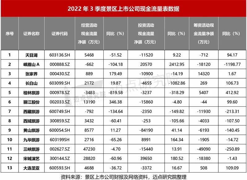 2022年3季度经营活动现金流量净额及同比来看,13家景区乐园总值11.22亿元,均值8634.23万元。经营活动现金流量净额为正10家,为负3家,分别为峨眉山A(000888.SZ)(-662万元)、桂林旅游(000978.SZ)(-3483万元)、西藏旅游(600749.SH)(-792万元)。13家景区集团经营活动现金流量净额同比均值为-60.07%,高于平均值7家,低于平均值6家。2022年3季度投资活动现金流量净额及同比来看,13家景区乐园总值-8.26亿元,均值-6351.23万元。投资活动现金流量净额为正3家,分别为峨眉山A(000888.SZ)(20570万元)、九华旅游(603199SH)(8991万元)、宋城演艺(300144.SZ)(39650万元);为负10家,其中2家超过1亿元。13家景区乐园投资活动现金流量净额同比均值89.47%,高于均值3家,主要是因为峨眉山A(000888.SZ)同比2412.95%,拉高同比均值。2022年3季度筹资活动现金流净额及同比来看,13家景区总值-8.99亿元,均值-6915.61万元。筹资活动现金流量净额为正4家,分别为张家界(000430.SZ)(14320万元)、长白山(603099.SH)(269万元)、桂林旅游(000978.SZ)(5407万元)、大连圣亚(600593.SH)(508万元),为负9家。13家景区筹资活动现金流净额同比均值为-84.84%,高于均值8家,低于均值5家。其中峨眉山A(000888.SZ)同比降低幅度最大,为-1198.77%。![]()