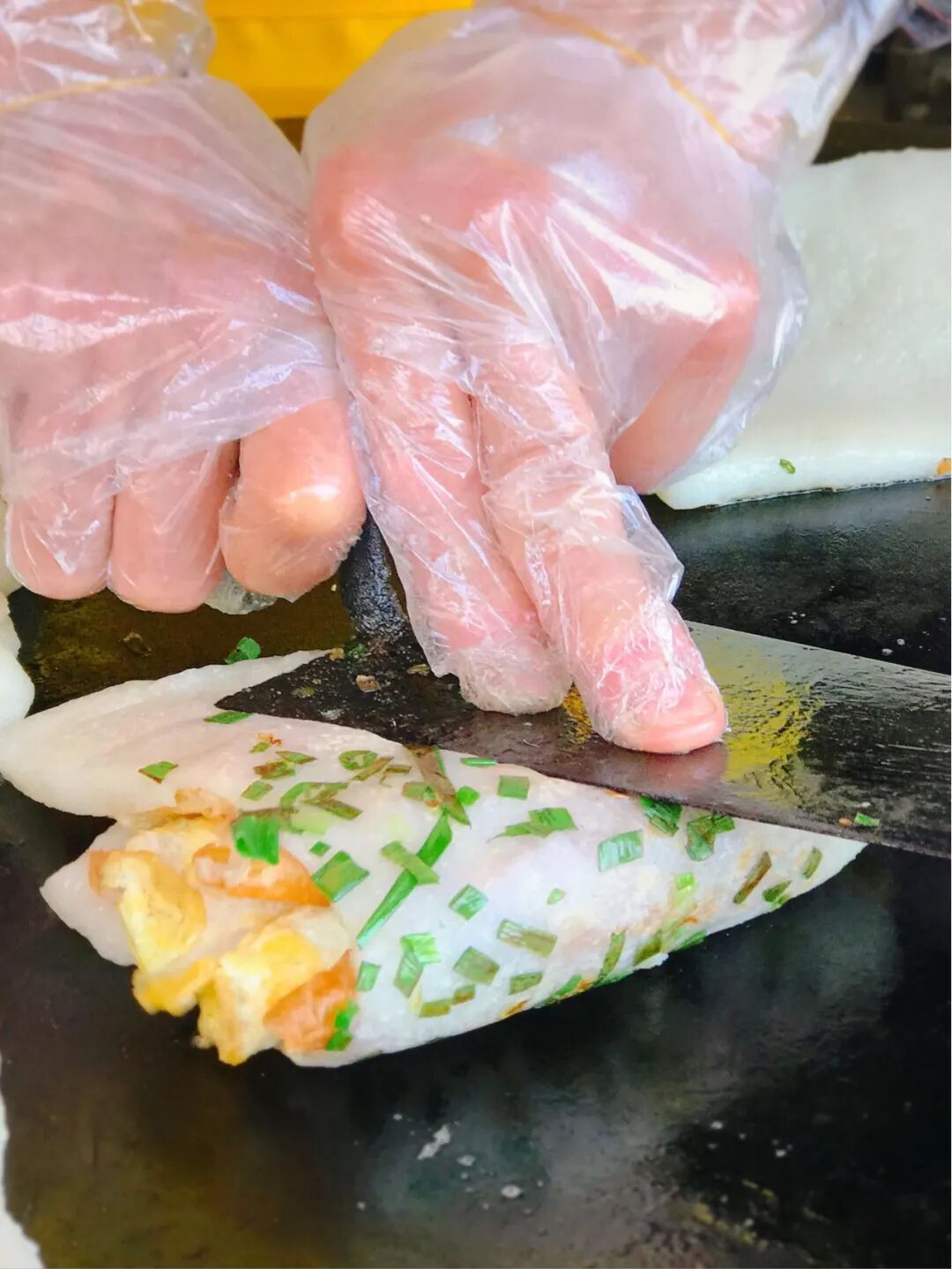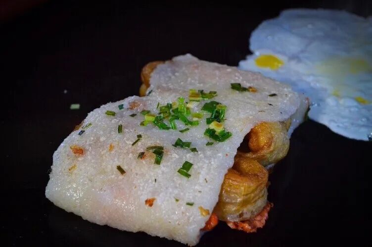 年糕被按在铁板上压得扁扁的,卷上油条、里脊之后却只需简单调味——一小撮盐、一把葱花,吃的就是猪油激发出的食材原味。