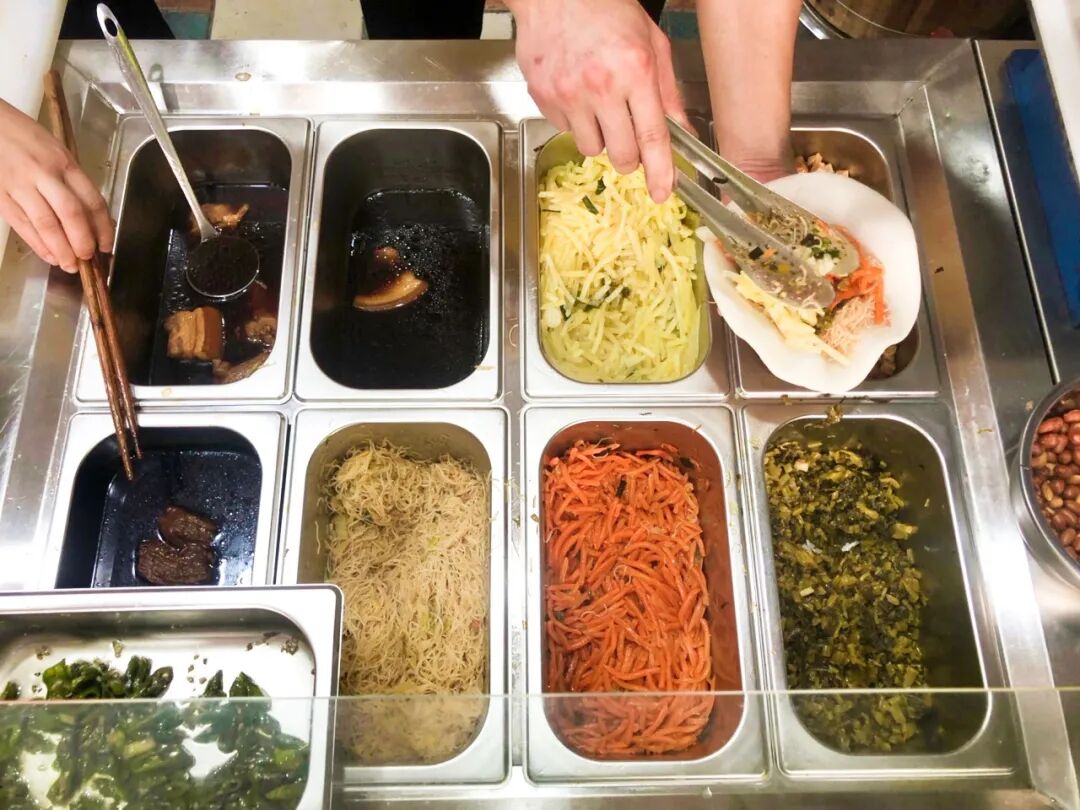 年糕饺顾名思义,就是用年糕做饺子皮,基础款配菜就有调过味的炒米线、香干、萝卜丝、土豆丝、包菜等等,虽说这种吃法源自于台州,但口味上还是比较宁波的。