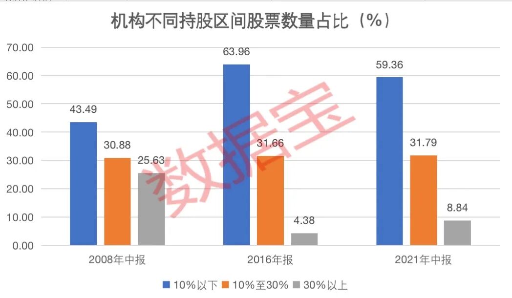 机构被视为“市场风向标”,机构持股比例高代表公司更具吸引力。以3个时间点最近的报告期的机构持股情况来看(一、三季报数据可能不全,取中报、年报数据,分别为2008年中报,2016年报、2021年中报),2008年中机构持股比例(加权平均)最高,接近18%,2021年中机构持股比例9%以上。