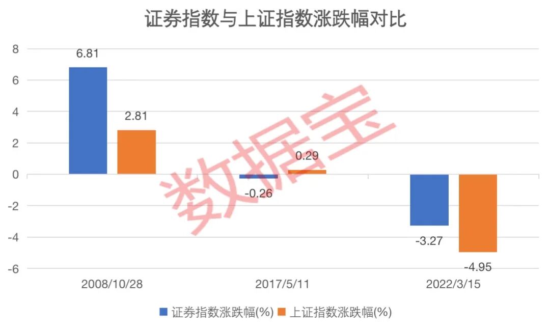 2008年10月28日,证券指数大涨6.81%,跑赢上证指数4个百分点;截至2017年5月11日,主力资金近5日净流入证券板块13.42亿元;2022年3月15日,证券指数小幅跑赢上证指数,次日涨幅超6%,主力资金净流入近40亿元,位居行业首位。