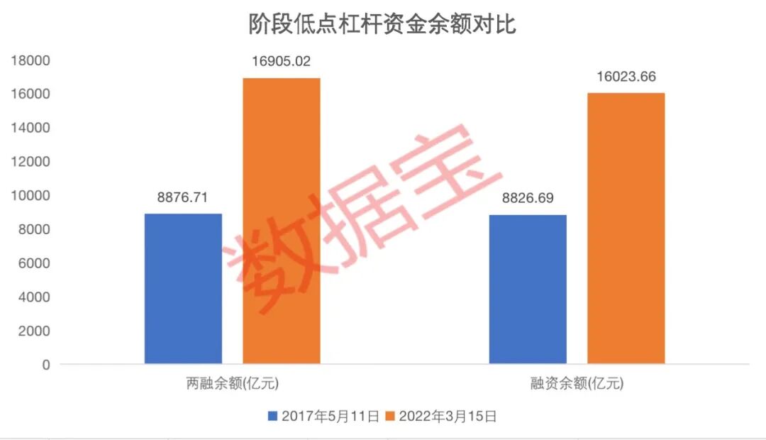2017年5月11日两融余额不到9000亿元,其中融资余额8826.69亿元,与2016年11月末的高点相比,融资余额下降近百亿;2022年3月15日,两融余额接近1.7万亿,其中融资余额超过1.6万亿元,较2021年9月15日融资余额高点17583.79亿元,下降1500亿。从降幅来看,前者较高点下降9.2%,后者下降8.9%,流出速度略有放缓。