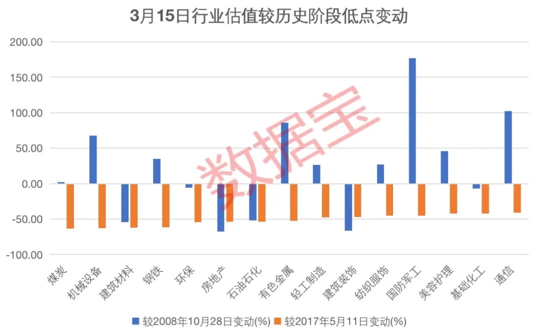 分行业看,12个行业估值低于2008年10月28日水平,25个行业低于2017年5月11日水平,建筑材料、环保、石油石化、建筑装饰等传统行业市盈率大幅下降,当前市盈率均低于20倍。通信、电子等行业当前市盈率较2017年5月11日下降40%以上。农林牧渔、汽车、食品饮料等当前估值较2个阶段低点(指2008年10月28日、2017年5月11日,下同)都要高出不少。