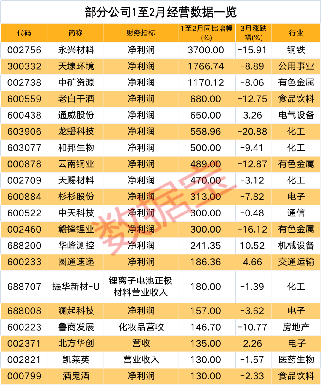 数据宝不完全统计(来自公司披露数据),50余家公司发布了前2个月的成绩,化工、食品饮料、电子、医药生物行业扎堆,均超过5股。发布净利润的36股业绩非常亮眼,前2个月净利润同比增幅均超过20%,翻倍股多达21只,永兴材料、天壕环境、中矿资源增幅超过10倍。部分公司仅用2个月就超额完成去年业绩,如中天科技、永兴材料等。药明康德、科德数控、中国中车等手握大巨额订单,产销势头良好。