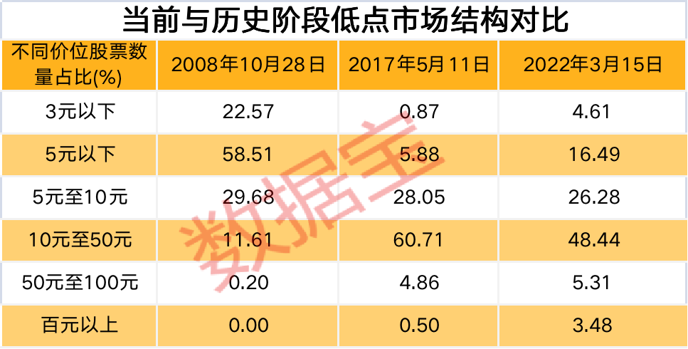 2008年到2022年,市场结构发生显著变化,低价股变得稀缺。根据经验,低价股在市场底部更容易反弹。2008年10月28日A股收盘价中位数4.39亿元,2017年5月11日13.5元,当前不到12元。