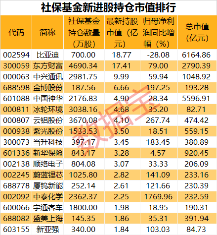 社保基金新进股中多为业绩同比大幅增长的绩优股,10只新进股2021年实现归母净利润同比增长翻倍,约占总数的四分之一。中泰化学、复旦微电、木林森盈利增幅居前,分别为1769.96%、287.20%、284.1%。