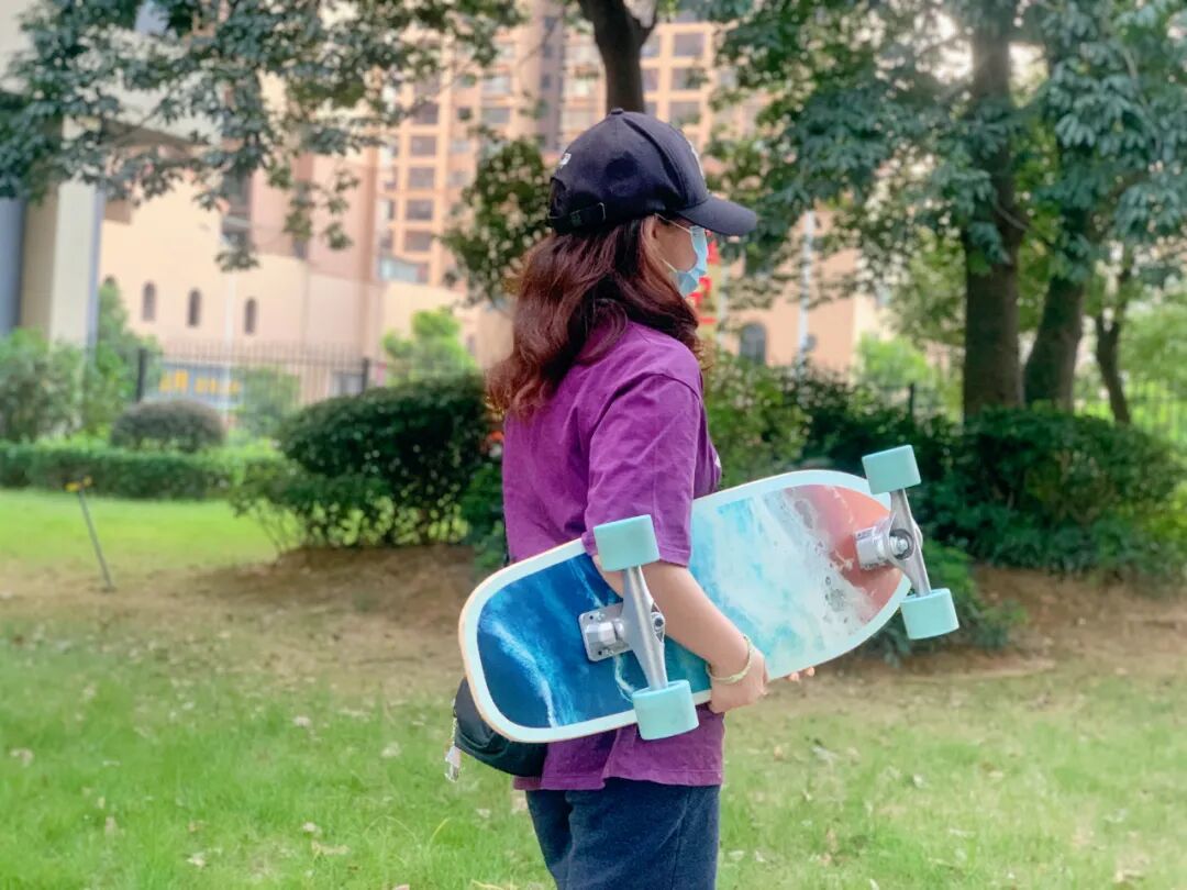 “我在某平台看到陆地冲浪的视频,然后被‘陆冲’吸引。刚好身边有朋友在玩,假期就借了她的板尝试玩一下。”阿君说,疫情期间,不想远游,刚好可以在家里的小区或者附近的广场运动。有时会约上三五好友一起玩,有时则自己练习动作。