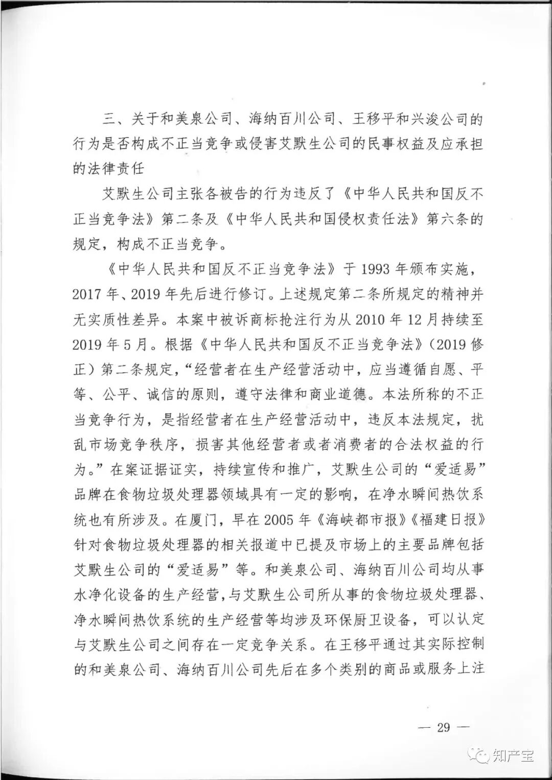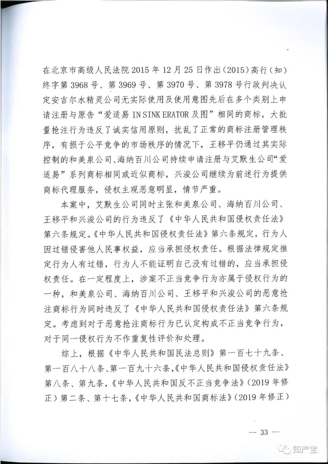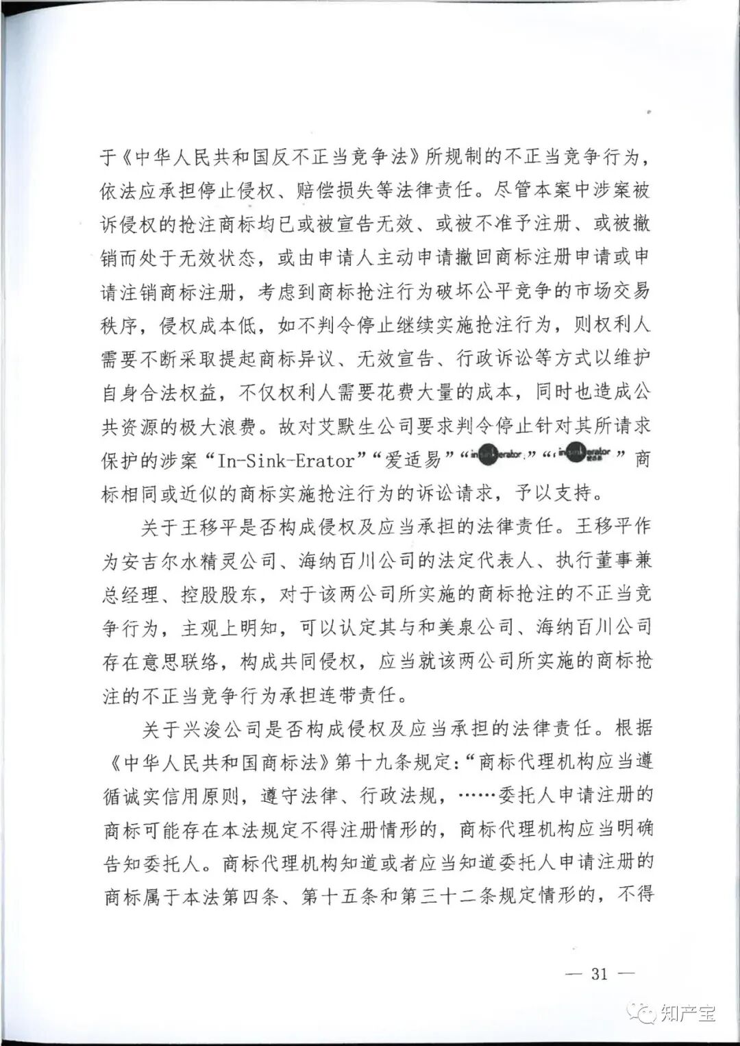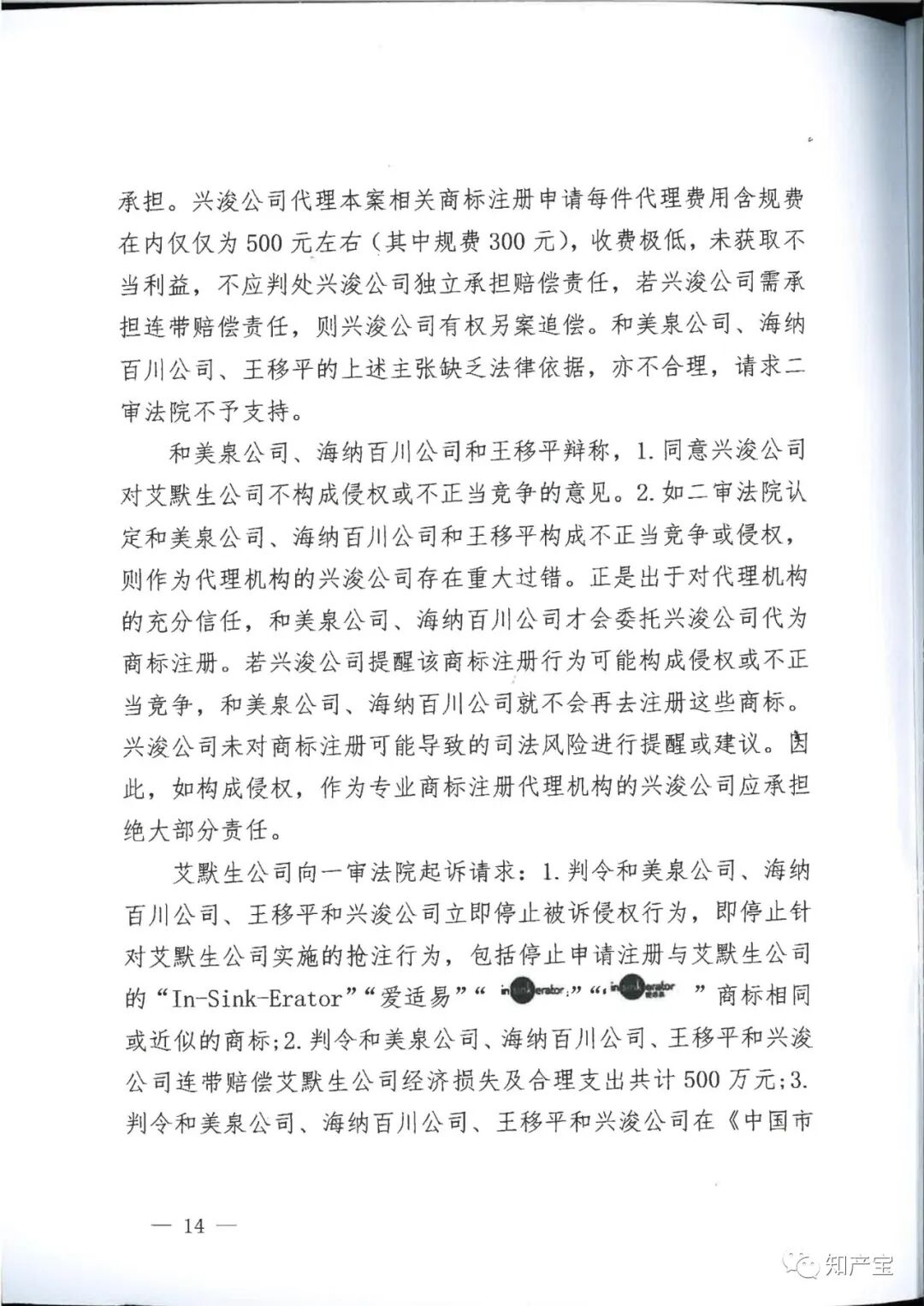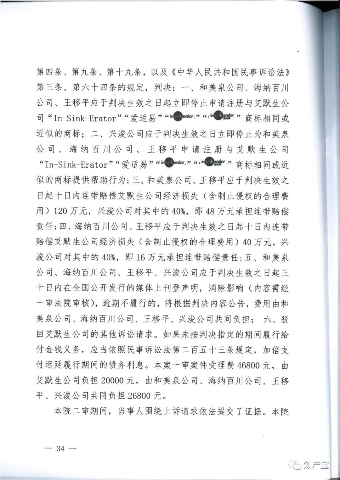 | 一审裁判结果 | 一、和美泉公司、海纳百川公司、王移平应于判决生效之日起立即停止申请注册与艾默生公司"In-Sink-Erator”“爱适易”“ 二、兴浚公司应于判决生效之日立即停止为和美泉公司、海纳百川公司、王移平申请注册与艾默生公司“In-Sink-Erator”“爱适易”“ 三、和美泉公司、王移平应于判决生效之日起十日内连带赔偿艾默生公司经济损失(含制止侵权的合理费用)120万元,兴浚公司对其中的40%,即48万元承担连带赔偿责任; 四、海纳百川公司、王移平应于判决生效之日起十日内连带赔偿艾默生公司经济损失(含制止侵权的合理费用)40万元,兴浚公司对其中的40%,即16万元承担连带赔偿责任; 五、和美泉公司、海纳百川公司、王移平、兴浚公司应于判决生效之日起三十日内在全国公开发行的媒体上刊登声明,消除影响(内容需经一审法院审核),逾期不履行的,将根据判决内容公告,费用由和美泉公司、海纳百川公司、王移平、兴浚公司共同负担; 六、驳回艾默生公司的其他诉讼请求。 | ||||||