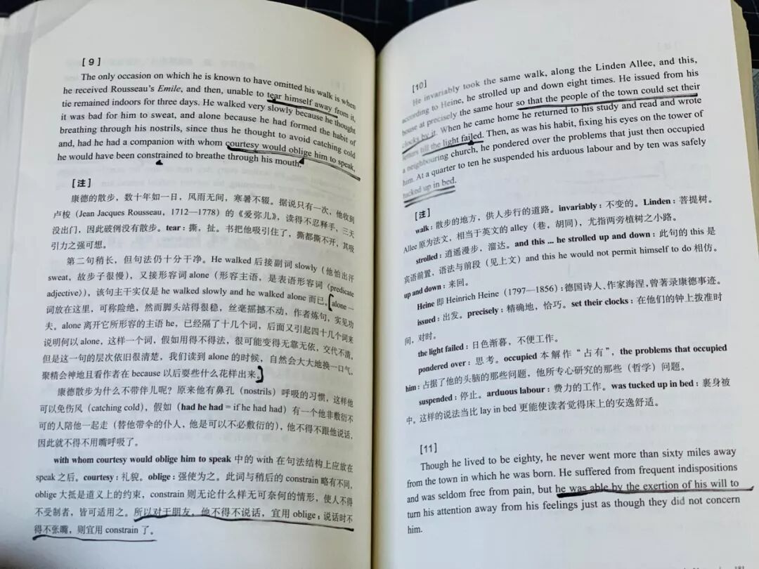我会先通读整段,遇到不认识的词、没有一次读懂的句子,先做标记。读完整段后再通过查词典、分析语法解决前面的问题,并做自己的赏析笔记。最后,再看先生的批注,通过对比找到差距。