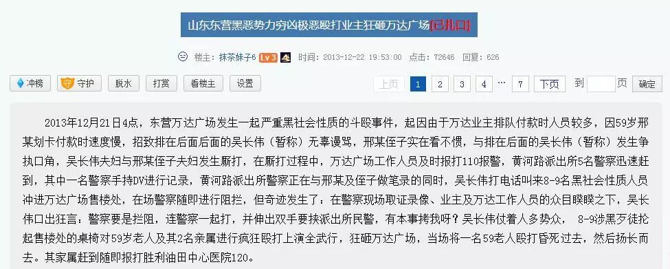 2014年元旦前后,一则名为《山东东营黑恶势力穷凶极恶殴打业主狂砸万达广场》帖子在东营的网上和自媒体上传播开来:由于万达业主排队付款时人员较多,因觉得排在前面的邢某付款速度慢,后面的一对夫妇对其无端辱骂,引发双方厮打。这二人,便是吴长伟和吴萍夫妇。而当派出所在现场调查时,这对夫妇竟打电话叫来8-9名黑社会性质人员冲进售楼处,众目睽睽之下,抡起售楼处的桌椅对邢某及其亲属进行疯狂殴打上演全武行,当邢某等三名伤者在中心医院进行检查治疗时,吴长伟又带领3名歹徒冲进中心医院,再次殴打邢某及其家人,并恐吓:“限当夜搬出医院、三天之后滚出东营!”一时间,舆论哗然。事件的细节是否准确已经不重要,社会公众的不满却跃然网上。