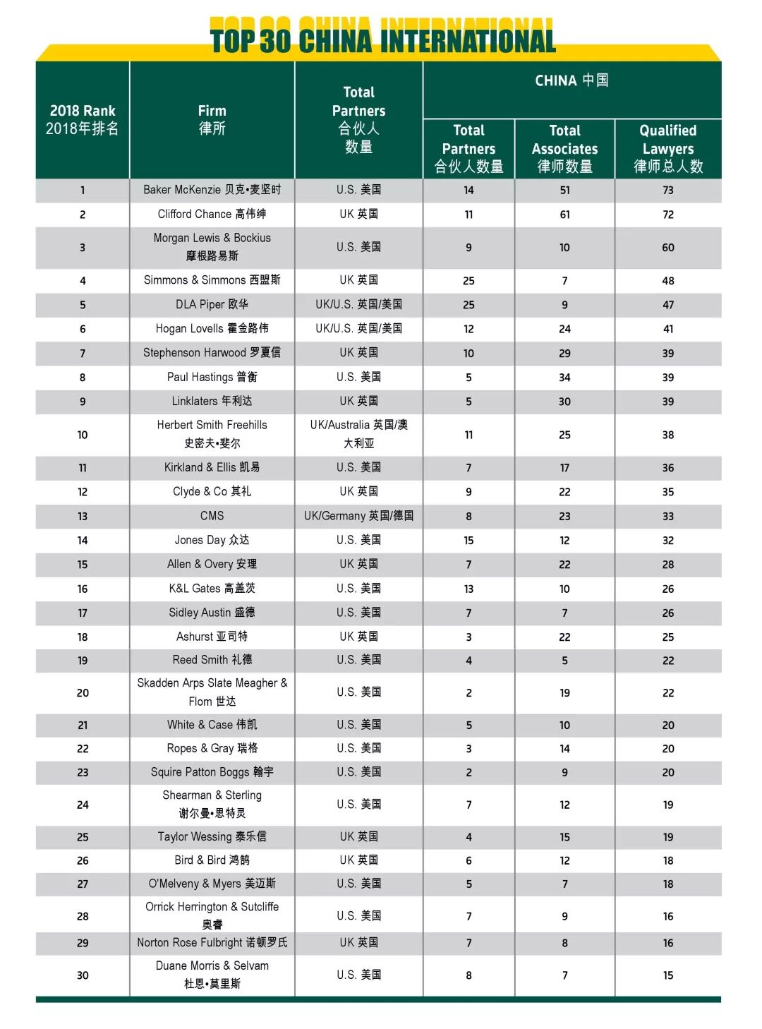 相对应,退出前30强榜单的五家律所分别是:科文顿•柏灵国际律师事务所、美国盛智律师事务所、孖士打律师事务所、富而德律师事务所、品诚梅森律师事务所。科文顿•柏灵和美国盛智都是2017年新入榜且位次还不错,去年分别以26和22位律师总数列居第12位和21位,今年双双落榜。
