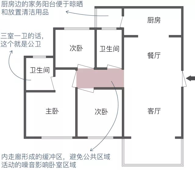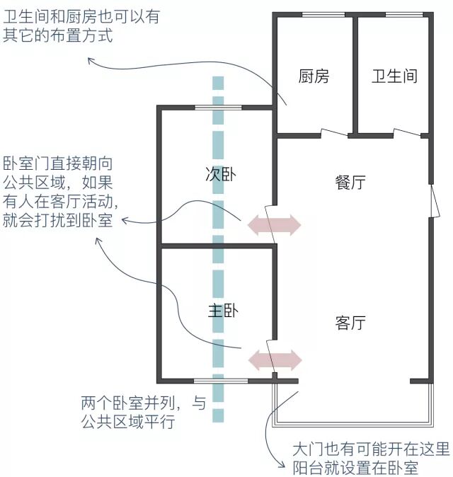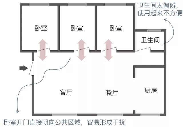 而两个次卧门直接朝向客厅的话,也同样会存在公共区域活动的家人打扰卧室休息的情况。