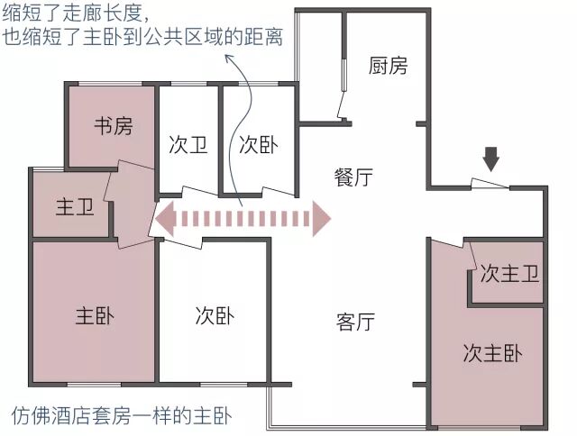 有的户型会把主卧套房布置在靠近入户的位置,这样屋主回家后可以直接进入主卧套房,不对其它人造成影响。