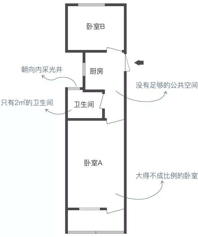 通常是塔楼中间套,只有一个采光面,主卧和客厅占据了最好的朝向,次卧和厨房的窗户只能朝向大楼凹陷处的采光井,采光会特别差。而卫生间的采光则直接就牺牲掉了。这样的二居室都是为了给大户型让出最好的朝向。
