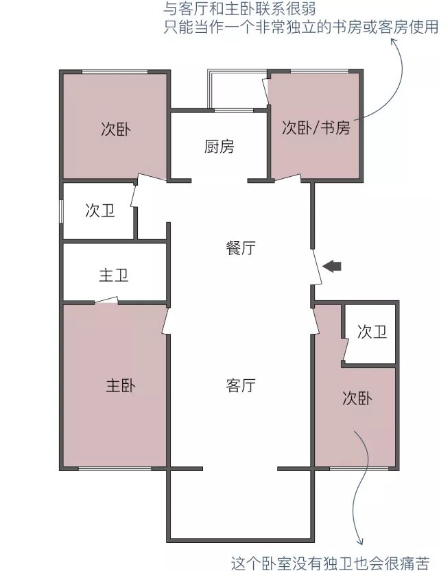 为了让卧室远离大楼中心、获得更好的采光,次卫通常都设计在进门一侧的角落,便利性受到影响。