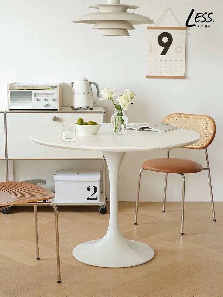 人多的情况下,一些造型优美的独腿圆桌,也能让餐椅更好地嵌进来,同时避免桌腿卡住凳子。
