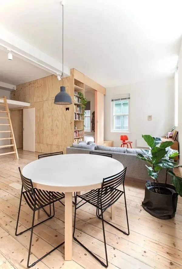 替换成直径 90cm 的圆桌,占地只有 0.6㎡,多出来的过道让狭小的餐区更有舒适感。