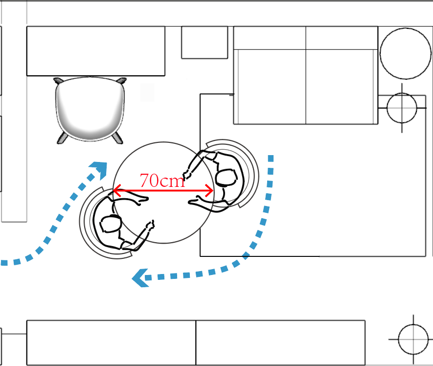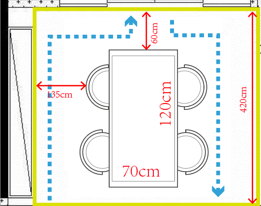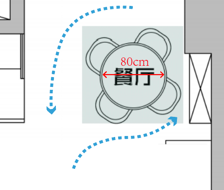 在下图这个边长约 420cm 的餐区,这张直径 100cm 的圆桌和四周之间都有至少 80cm 的通道。