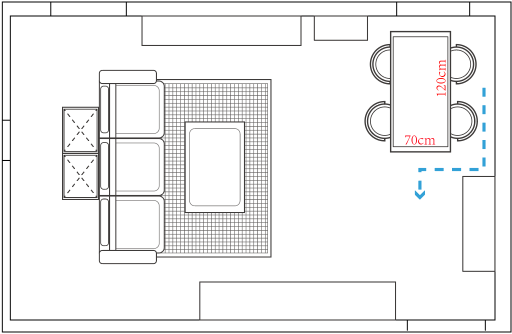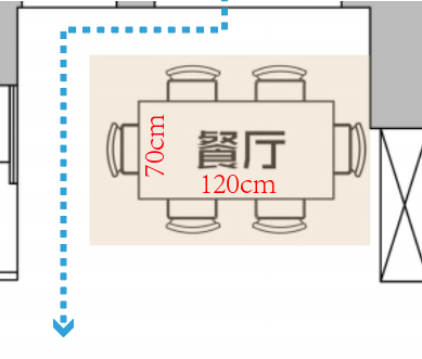 同样的餐桌面积,如果换成长桌,至少需要 70×120cm,这种情况下,两端只有 60cm 的通行空间,拐弯时未免显得局促。