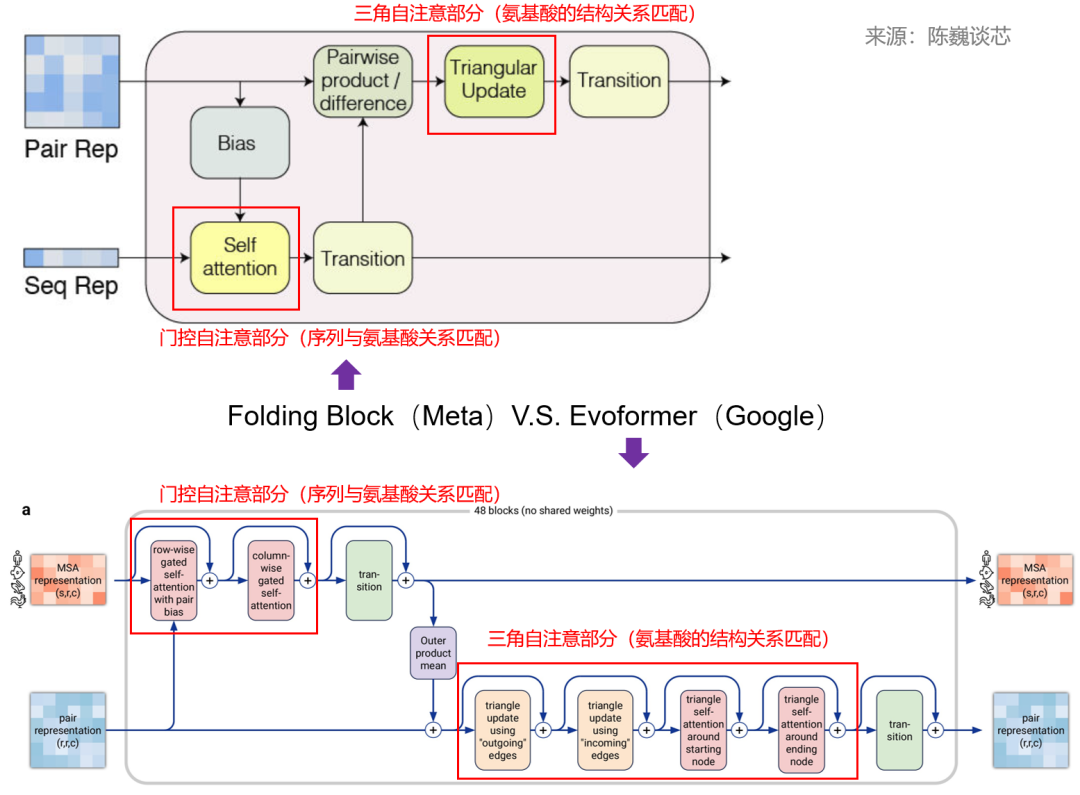 ▲ESMFold Folding Block与AlphaFold2 Evoformer结构对比