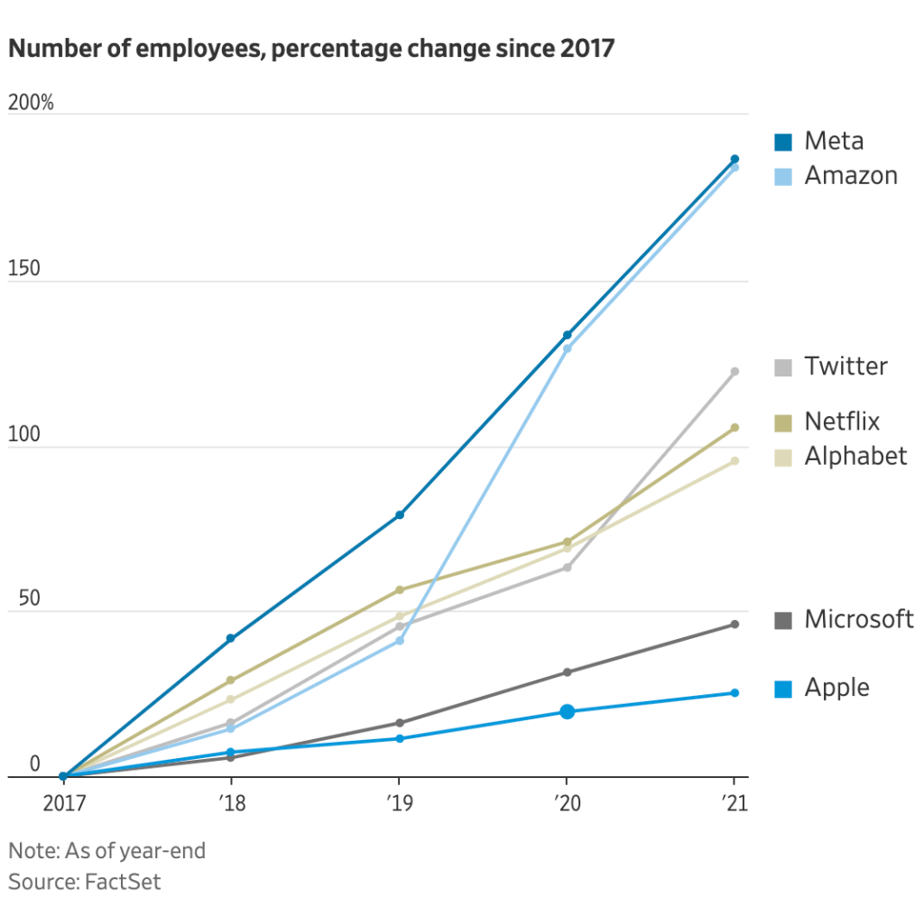 ▲大型科技公司自2017年以来的员工数量增幅变化(图源:华尔街日报)