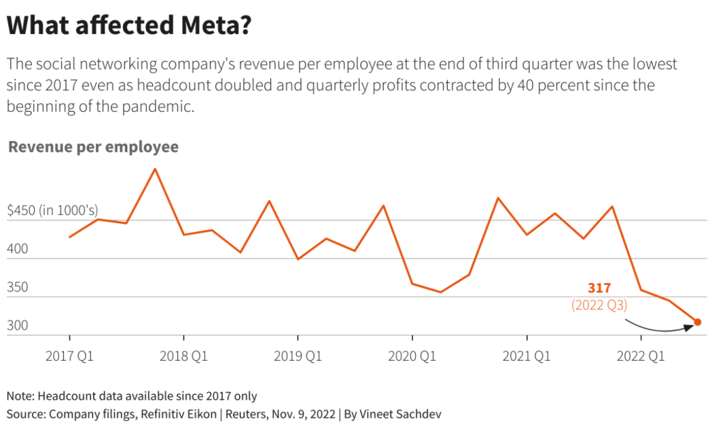 ▲Meta在第三季度末的平均每名员工收入是2017年以来的最低水平,尽管员工人数翻了一番,其季度利润自疫情开始以来“缩水”了40%(图源:路透社)