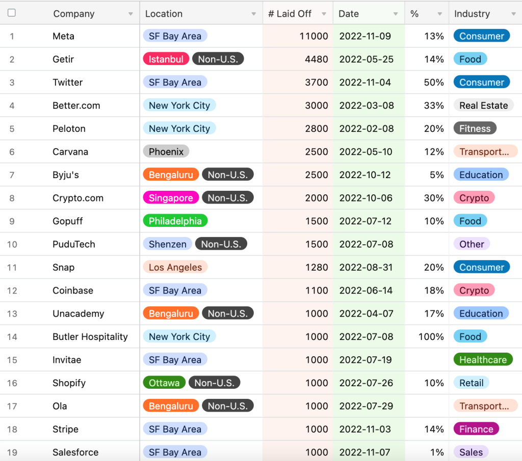 根据追踪科技行业裁员的网站Layoffs.fyi披露的数据,今年已有763家科技企业共计宣布裁员逾10.6万人。社交软件巨头Twitter、支付公司Stripe、网约车公司Lyft、Salesforce等都在裁员。即便是更具弹性的苹果、亚马逊、谷歌母公司Alphabet等公司,也暂停或放缓了招聘。![]()