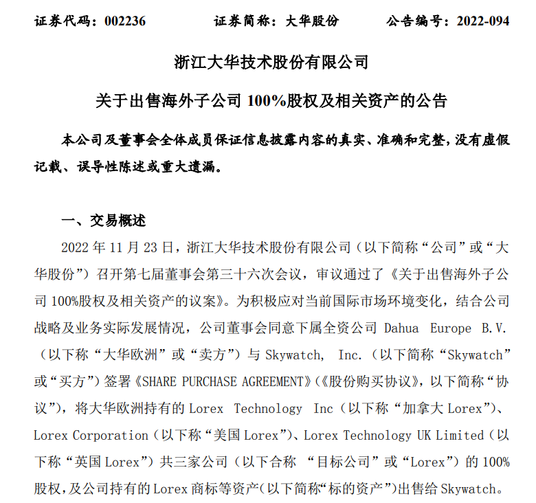 直到今年11月23日,美国FCC再发禁令前夕,大华到了不得不放弃Lorex的时候。买方Skywatch是一家2022年9月创办的新公司,注册地在开曼群岛。股权交割时Skywatch的控股股东将变更为富代投资股份有限公司,该公司为交易交割后的分期付款提供连带担保责任。这意味着Lorex品牌产品将能继续在美国流通,而Skywatch交易交割时立马支付的6169.2万美元(约占全部价款的85%)也将为大华股份输血。