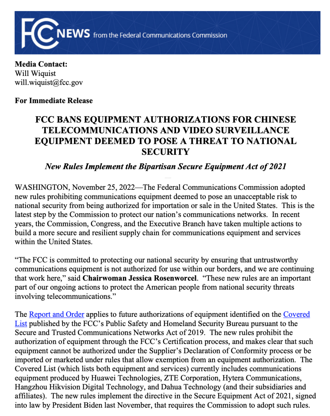▲美国FCC相关公告