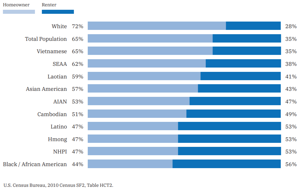 • 越南裔 (65%)、老挝裔(59%) 和柬埔寨裔 (51%) 买房的人数超过租房的人数。
