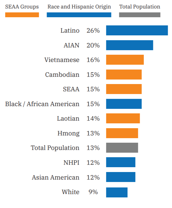 • 在多项衡量收入的指标中,东南亚裔的表现严重低于全国平均水平。在低收入者这个群体中,东南亚裔比别的族裔低收入群体情况更糟糕。